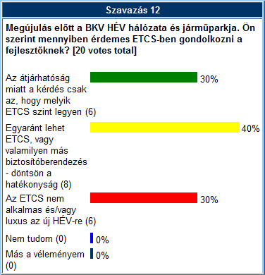 Élettartama végén jár a legtöbb HÉV jármű - teljes rekonstrukcióra szorul az infrastruktúra is - közúti gyorsvasút helyett (elő)városi gyorsvasúti igények - átjárhatóság - növekvő sebesség, növekvő biztonsági követelmények. Ön szerint lehet-e középtávon keresnivalója az ETCS-nek a megújuló HÉV vonalakon és az új járműveken? Kérjük szavazzon a 4e-lapokon novemberben is!