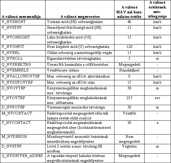 A Nemzeti érték (3) paket változói, azok mnemonikjai, MÁV értékei valamint mértékegységei a következő, 1. ábrán látható táblázatban találhatók: Az itt jelzett értékek és engedélyek illetve tiltások a „Feltétfüzet az ETCS L1 és L2 pályamenti alrendszerre vonatkozó követelményekre” nevű anyag szerintiek.