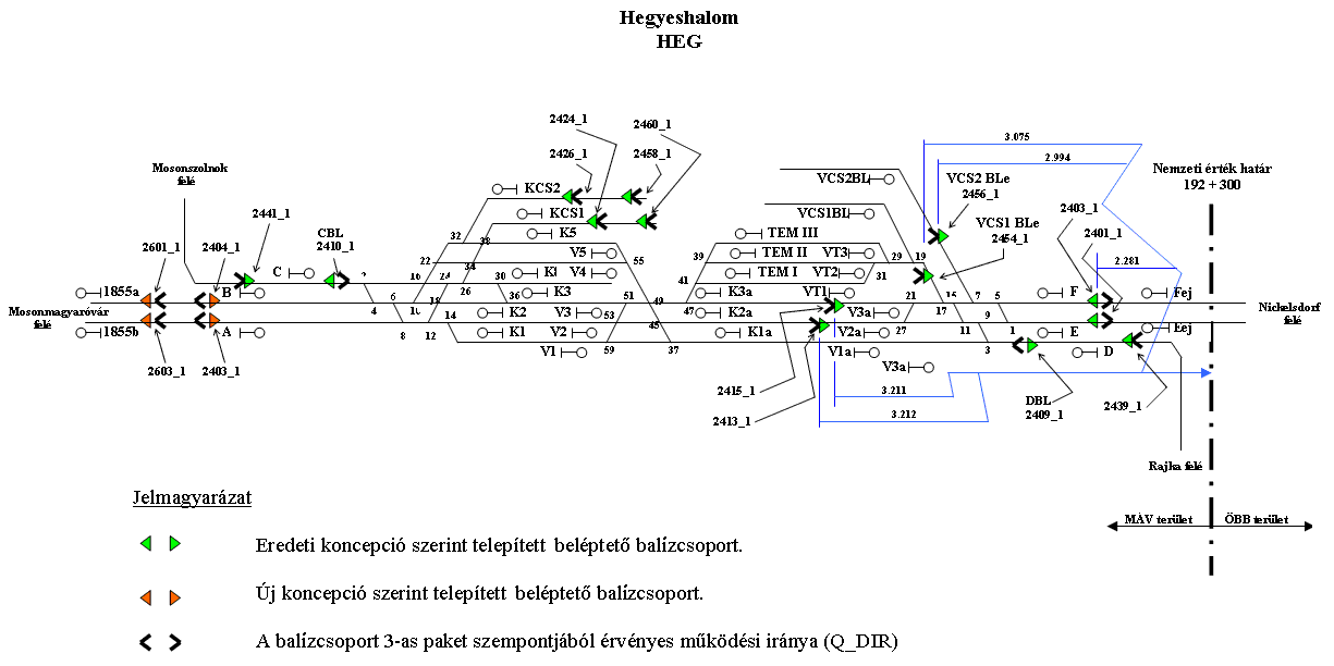 A 3. ábrán látható második dolog az, hogy a 3-as paket felviteli pontjai kétféle színjelöléssel rendelkeznek. Ennek a különbségtételnek az az oka, hogy a magyar nemzeti értékmegadás koncepciója időközben megváltozott. Először a minimális számú ponton való nemzeti értékmegadás elve lett érvényesítve. Ennek alapján csak a becsatlakozó irányokon, valamint a rendszervégeken került telepítésre egy-egy magyar és osztrák nemzeti értéket feladó balízpár. A magyar nemzeti érték feladás esetében Budaörsnél annyi a specialitás, hogy mindez térközben történik. Hegyeshalomban és Nickelsdorfban viszont az a különlegesség, hogy az értékmegadás a „Nemzeti érték határa” nevű pontra esik mindkét oldalról. Ennek a speciális nemzeti értékadásnak az elve a D_VALIDNV megadásnál már ismertetve lett, ugyanakkor ennek az erre az állomásra érvényes vektoros ábrázolása a 4. ábrán, a skaláris, azaz a táblázatos ábrázolása pedig az 5. ábrán van bemutatva.
