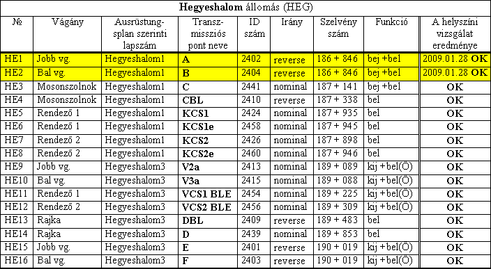 5. ábra - A Nemzeti érték feladópontjai Hegyeshalmon való megjelenítésének skaláris, azaz táblázatos módja